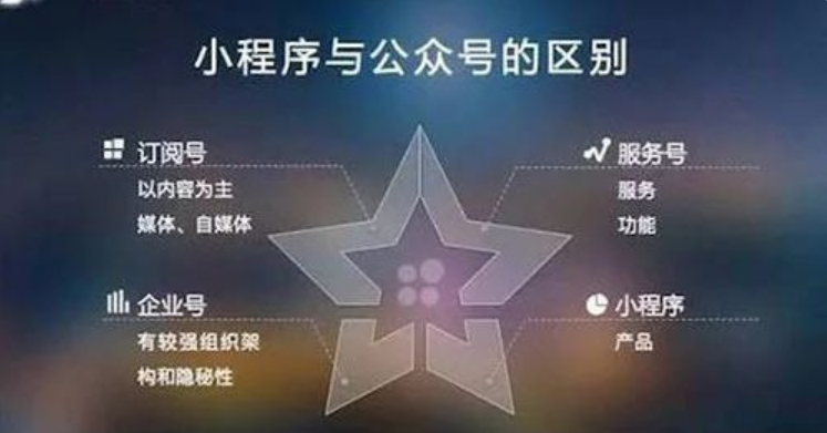 微信與公眾號在開發語言、設計規范、營銷方式、審核機制等功能方面均有較大不同。公眾號是一種賬號類型,為用戶提供信息與咨詢發布平臺,提供了一種 新的信息傳播方式,構建與讀者之間更好的溝通與管理模式,結合H5以后公眾號也能夠提供一些簡單交互功能。小程序主要旨在提供服務,相比公眾號運行更流 暢,能夠提供更加復雜的產品與服務。公眾號功能主要圍繞信息傳遞與營銷展開,小程序對營銷功能進行了嚴格控制以與公眾號區別,使得小程序的服務在使用體驗 與便捷性能夠得到提升,不至于淹沒在公眾號過度營銷信息中。